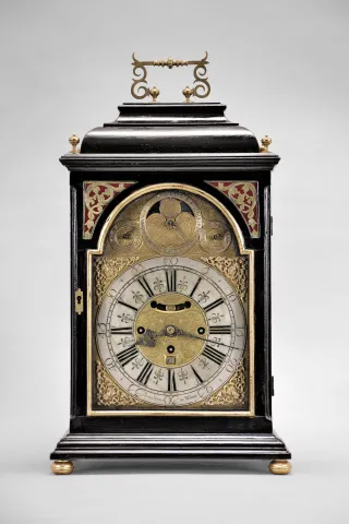 Peter Humps, in Wienn, a mid 18th century, grand sonnerie striking bracket clock with date and phases of the moon, ebonized case with molded base on turned, gilt feet, the arched, gilt lined, glazed door with textile backed engraved frets at upper corners, case sides also with glazed, gilt lined, arched windows and sound frets, the caddy top with ornate carrying handle, and flanked by four turned finials, brass composite dial with roman numeral chapter ring and arabic five minute markers, center with foliate engraving and date aperture above 6:00, and cutout to view mock pendulum below 12:00, corners with cast spandrels, and the arch with regulator, strike/ silent control, and moon phase display, blued steel hands, 30- 60 hour, three train movement with engraved backplate, decorated crutch, turned pillars with central knop, crown wheel escapement, fusee for time train, Viennese striking, and repeating the last hour and quarter on demand, and small, engraved brass pendulum bob with steel rod case with restoration to ebonizing and gilding, feet replaced, wooden strips retaing glass in case sides replaced, finials replaced, interior with added wooden cleat to support weight of movement, and with added pins to hold the movement in place, dial dirty and with minor tarnish, movement with minor tarnish and minor oxide on steel components, parts for rise and fall regulation missing, ticks and strikes, striking incorrectly set up, and so sounds the incorrect quarters, hour rack tail with old repair, needs attention as the clock always strikes 12:00, hour strike train mainspring broken