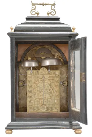 case with restoration to ebonizing and gilding, feet replaced, wooden strips retaing glass in case sides replaced, finials replaced, interior with added wooden cleat to support weight of movement, and with added pins to hold the movement in place, dial dirty and with minor tarnish, movement with minor tarnish and minor oxide on steel components, parts for rise and fall regulation missing, ticks and strikes, striking incorrectly set up, and so sounds the incorrect quarters, hour rack tail with old repair, needs attention as the clock always strikes 12:00, hour strike train mainspring broken