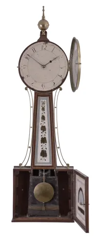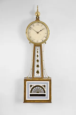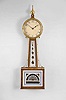 Willard school banjo wall clock, 8 day, time only, weight driven movement with T-bridge suspension in an inlaid mahogany case with reverse painted throat and lower tablets and a painted metal dial the case has had veneer restoration and the bottom has been replaced along with other restorations. The tablets have been repainted. The dial has been properly conserved and is in good condition with original paint and some fading to numerals. The hands are original. The finials are replacements.