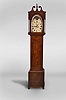 New Jersey area tall case clock, 8 day, time and strike, weight driven movement in a mahogany and mahogany veneer case with a broken arch pediment, center finial, four full columns flanking hood over rectangular trunk door and base with crotch mahogany