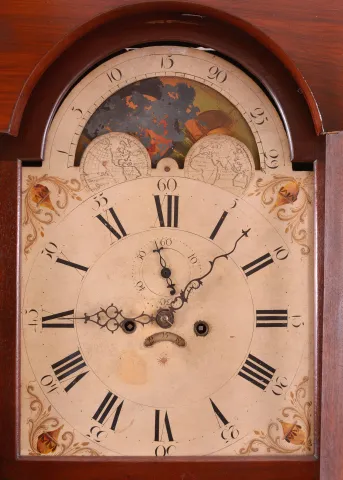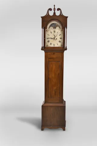 New Jersey area tall case clock, 8 day, time and strike, weight driven movement in a mahogany and mahogany veneer case with a broken arch pediment, center finial, four full columns flanking hood over rectangular trunk door and base with crotch mahogany veneer. The painted metal dial has moon phase, seconds bit and calendar. the case has been nicely rubbed down and retains an old finish. The right arch on hood has a repair and there is a split in the upper backboard. The center finial and feet are replaced. The dial has inpaint and the moon phase is flaking. Second hand replaced, but hour and minute hands proper. The pendulum has a brass clad bob.