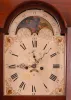 the case has been nicely rubbed down and retains an old finish. The right arch on hood has a repair and there is a split in the upper backboard. The center finial and feet are replaced. The dial has inpaint and the moon phase is flaking. Second hand replaced, but hour and minute hands proper. The pendulum has a brass clad bob.