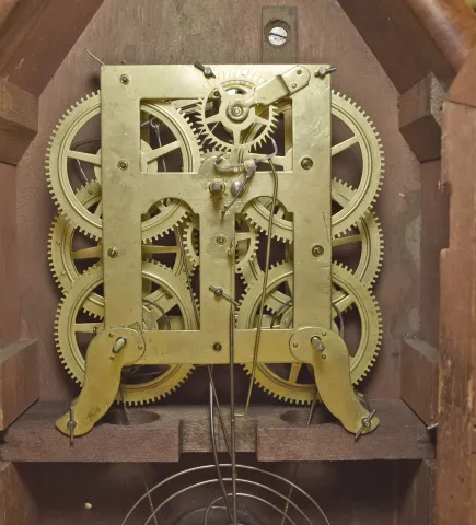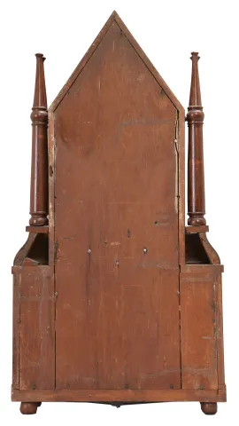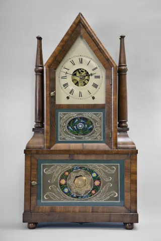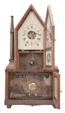 Birge & Fuller, Bristol, Conn., 8 day, time and strike wagon spring brass movement steeple on frame with candle finials shelf clock.