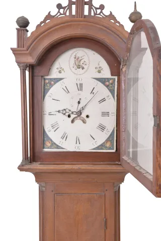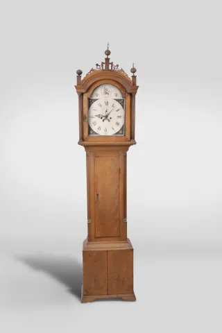 New England tall clock, 8 day, time and strike, weight driven movement in a cherry case with fretwork top, three brass finials and fluted columns on hood over trunk with fluted corner columns with brass capitals over base resting on ogee feet the case retains its original finish with an age split to base panel. The ogee feet have been shortened. The fretwork top is complete, but in several pieces. Two of the three period finials have damage to the tips. The dial paint and hands are original and the dial is in good condition. The shaft on the seconds hand needs to be extended. The winding crank, tin can weights and brass clad bob are all period.
