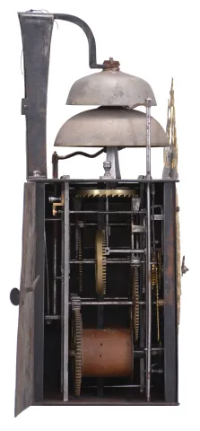 Beautifully cast dial with inset enamel cartouche numerals. All appear to be in very good condition. There is some light rust on the iron hands. Nicely made screws with chamfered corners as well as teardrop shapes to hold the movement together. Very tall suspension shroud measuring a full 6 inches in height. Four bladed iron fly. Simple turned crown wheel arbor support. Light rust on iron components of the movement. Iron plate on the back of the case is contoured for clearance of the pendulum. Unusual strike system triggering system with pierced heart shape on the end of the trip piece. The heart motif is also used for the hole through which the crutch passes. No weights or pendulum are included with this clock. This clock was sold by Ivoire Saint-Etienne on June 2nd, 2012 as lot number 47.