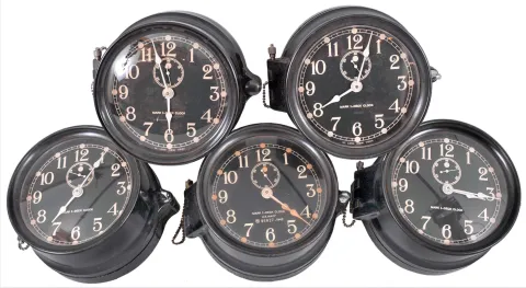 Clocks- 11 (Eleven) Deck Clocks: M. Low, New York, "Mark I- Deck Clock", 8 day, time only, spring-driven jeweled movements in black phenolic cases with hinged bezels, white and black dials with subsidiary seconds, most with rear mounting plates.