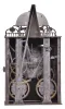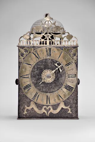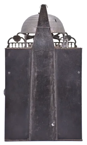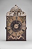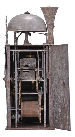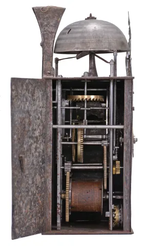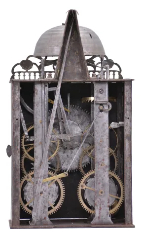 Tarnish and polishing residue on brass chapter ring. Rust spots on iron plates, posts and arbors. Turned escape wheel arbor support. Small stepped feet on movement uprights. Movement strikes the hour with one hammer and the half hour with another. A third hammer is for the alarm. Robust four-bladed fly. Bell decorated with turned stripes. The bell has two small holes which are the result of a casting flaw. Flat brass fronton has a crowned "R" in the center. Suspension shroud is 4.5 inches tall. Rear panel of clock has contoured section to provide clearance for the pendulum. No weights or pendulum come with this clock.