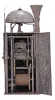France, Comtoise clock, 8 day, time and strike with alarm, weight driven movement with verge escapement, thread suspension with rear-hanging pendulum in a iron post and plate frame, brass chapter ring with engraved Roman numerals, alarm dial with Arabic numerals, single brass hand, applied brass spandrels and pivoted winding arbor shutters, topped by flat pierced brass fronton with trademark. Tarnish and polishing residue on brass chapter ring. Rust spots on iron plates, posts and arbors. Turned escape wheel arbor support. Small stepped feet on movement uprights. Movement strikes the hour with one hammer and the half hour with another. A third hammer is for the alarm. Robust four-bladed fly. Bell decorated with turned stripes. The bell has two small holes which are the result of a casting flaw. Flat brass fronton has a crowned "R" in the center. Suspension shroud is 4.5 inches tall. Rear panel of clock has contoured section to provide clearance for the pendulum. No weights or pendulum come with this clock.