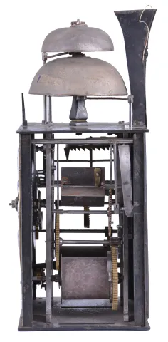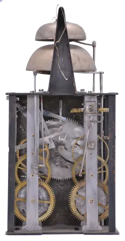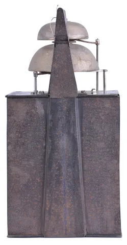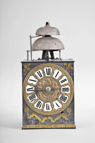 Enamel numerals are in very good condition. Flat brass fronton is absent from the top of the clock. The side doors are missing. The clock has three hammers and two bells. The hours and alarm are struck on the lower, larger bell. The half hours are struck on the smaller, upper bell. Lower bell is embossed with "Joseph Dubois ". There are many nice construction details within the movement including a lightly made crown wheel, turned and faceted crown wheel arbor support, and decorative hardware. Four bladed iron fan. Movement uprights with small, but distinct feet. Suspension shroud is 5 inches tall. Pendulum leader is missing. No weights or pendulum are provided with this clock. Sold by Ivoire Saint-Etienne on October 13th, 2012, lot number 58.